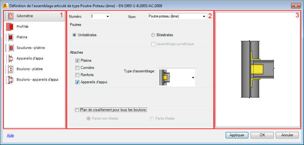 - La partie droite contient la vue graphique de l'élément de l'assemblage poutre-poteau défini.