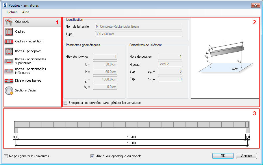 La boîte de dialogue de génération d'armature de poutres se compose de trois éléments principaux :