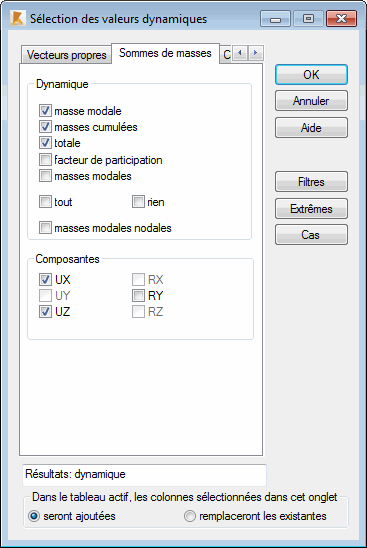 - Composants. Selon la sélection effectuée dans la boîte de dialogue, les colonnes contenant les composants UX, UY, UZ, RX, RY ou RZ de la masse modale, de la masse totale et des coefficients de participation modaux s’affichent dans le tableau.