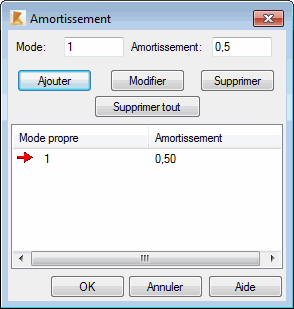 Pour définir la valeur d’amortissement d’un mode caractéristique, entrez le numéro du mode caractéristique et la valeur d’amortissement correspondante et cliquez sur Ajouter.