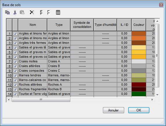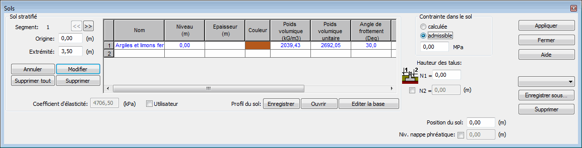 Les paramètres principaux du sol peuvent être modifiés ; après la validation de nouvelles valeurs, les autres paramètres sont calculés et affichés dans le tableau. Les champs du tableau, excepté les champs contenant les paramètres principaux, ne sont pas actifs.