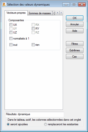 - UX, UY, UZ, RX, RY ou RZ. Si vous cochez ces cases, les colonnes contenant les composants UX, UY, UZ, RX, RY ou RZ des vecteurs propres, respectivement, obtenues lors des calculs sont ajoutées.