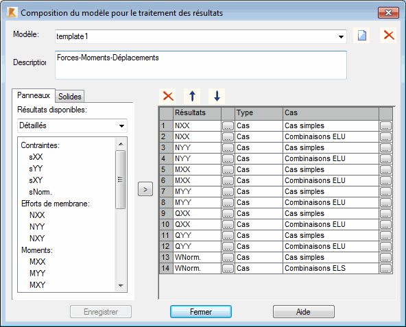 - La colonne Type permet de déterminer les types de résultats (efforts, moments, contraintes, déplacements, etc.) à traiter.