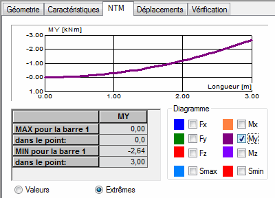 La partie supérieure de la boîte de dialogue contient un diagramme de grandeurs. Le champ peut afficher un diagramme pour une seule grandeur. Les diagrammes de grandeurs suivants sont disponibles : Efforts FX, FY et FZ, Moments MX, MY et MZ, et Contraintes Smax et Smin. Si vous changez le cas de charge, le diagramme est redessiné.