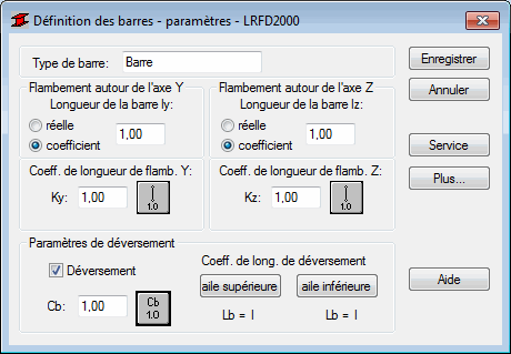 Dans le champ Coeff. de longueur de flamb., vous pouvez définir les coefficients de longueur de flambement de la barre en deux directions. Le logiciel propose automatiquement la longueur réelle de la barre (ou, éventuellement, la longueur totale des barres composantes).
