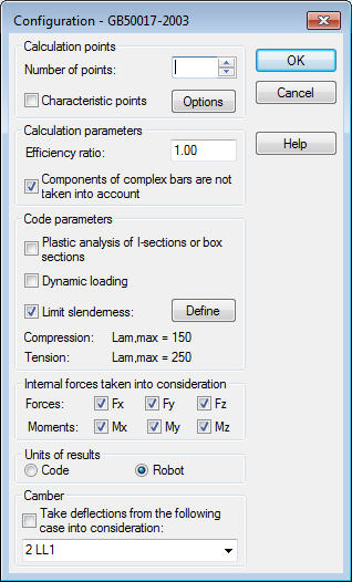 La boîte de dialogue Configuration permet de définir les paramètres appliqués lors de la vérification d'une barre en acier (normes acier chinoises). La boîte de dialogue s'ouvre après un clic sur le bouton Configuration dans la boîte de dialogue Calculs. La boîte de dialogue présentée ci-dessous s’affiche.
