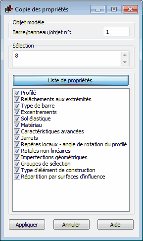 Utilisez cette option pour attribuer rapidement des attributs basés sur des paramètres copiés à partir d'objets créés précédemment. Vous pouvez utiliser cette option pour copier tous les attributs d'un objet (par exemple, pour une barre : les sections, les relâchements, les rotules, etc.) et les appliquer à d'autres objets.