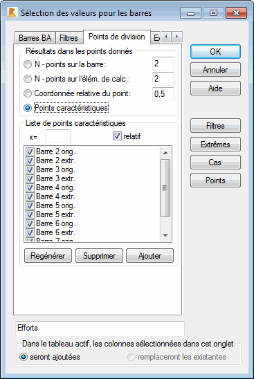 - Ajouter - ajoute des points sur la longueur de la barre pour lesquels les grandeurs indiquées seront présentées dans le tableau.
