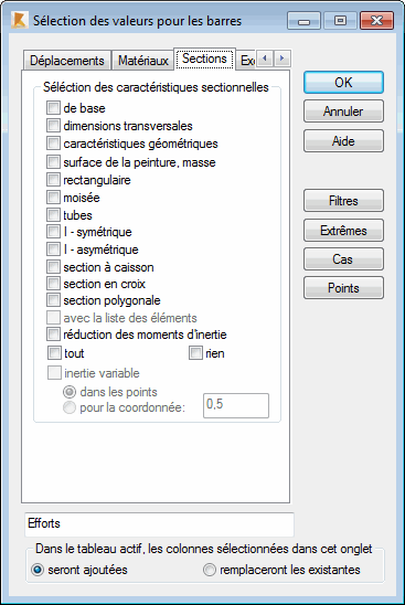 Sélectionnez l’onglet Sections, dans la boîte de dialogue Sélection des valeurs pour les barres pour définir les données de coupe de barre à présenter.