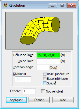 L’option sert à créer des éléments surfaciques ou volumiques simples en utilisant la révolution des objets 2D autour de l’axe sélectionné. L’option est accessible via l'une des méthodes suivantes :