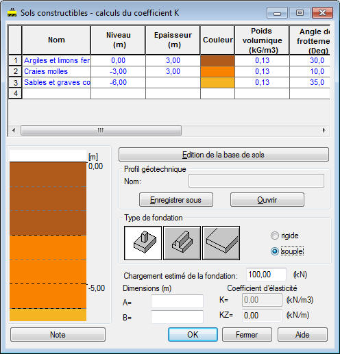 La calculatrice permet le calcul du coefficient d'élasticité directement sur la base d'un profil défini d'un sol en couches et propose les fonctions suivantes.