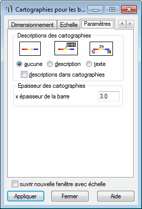 - La zone Epaisseur des cartographies vous permet de déterminer un nombre qui définira le rapport de la ligne utilisée à l'affichage d'une carte à l'épaisseur d'une ligne représentant les barres de la structure.