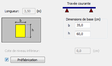 Si l’option Préfabrication est activée, un clic sur le bouton Préfabrication ouvre une nouvelle boîte de dialogue dans laquelle vous pouvez définir la hauteur et la longueur d’appui de la poutre préfabriquée.