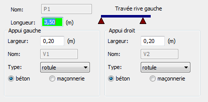 Dans cette boîte de dialogue, l'utilisateur peut préciser le nom d'une travée (la travée courante) et certaines informations de base relatives à sa géométrie : longueur de travée, paramètres des appuis (largeur, nom des appuis droit et gauche, type d'appui : épingle, fixe ou enroulé, type de matériaux de l'appui : appui béton ou maçonné). Cette boîte de dialogue propose aussi l'option Bloquer torsion. Si cette option est activée, la torsion ne sera pas prise en compte pour l’appui sélectionné.