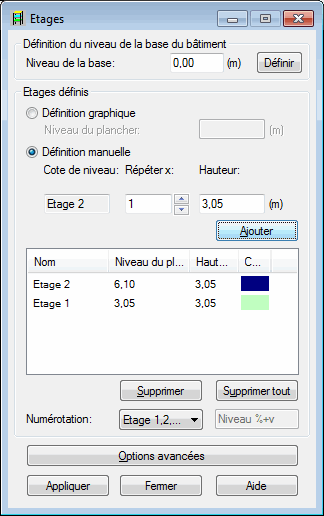 Le champ Etages définis contient la liste des étages définis. L’étage peut être défini de deux manières :