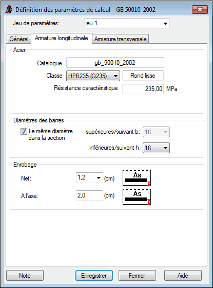Voici l'onglet Armature longitudinale de la boîte de dialogue Définition des paramètres de calcul pour la norme chinoise GB 50010-2002 :