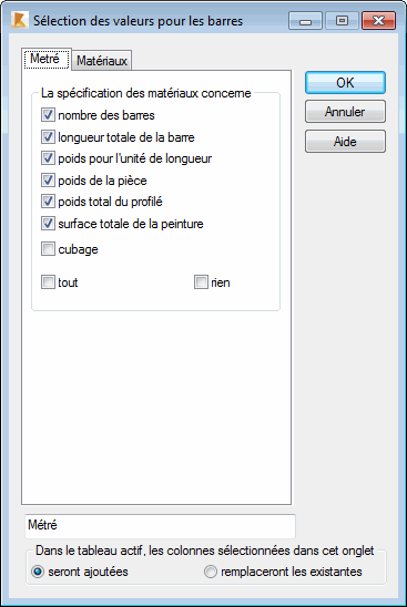 - Longueur totale de la barre : ajoute une colonne pour toute la longueur de barre. Dans la partie inférieure du tableau s'affiche la longueur totale des barres composées de la section donnée.