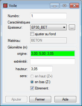- Matériau (ce champ n'est pas éditable ; il indique le matériau défini pour le type d'épaisseur du voile sélectionné).