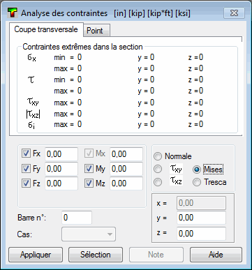 Après la sélection de l’onglet Transversal, la boîte de dialogue Analyse des contraintes affiche les contraintes extrêmes calculées pour la section transversale sélectionnée.