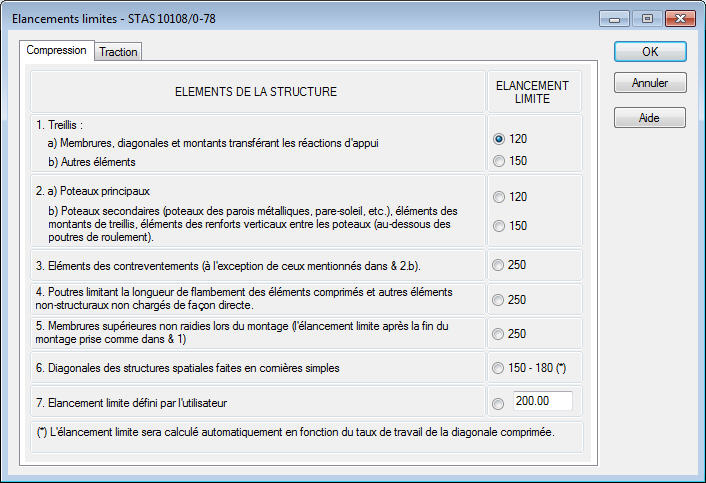 L'onglet Compression comprend un ensemble d'éléments de structure dont la norme définie dans le tableau 23 définit les valeurs limites d'élancement des éléments en compression. Si le cas 6 est sélectionné, le programme déterminera alors automatiquement, pendant l'exécution des calculs, l'élancement limite, et le comparera à l'élancement réel calculé pour la barre pendant l'analyse.