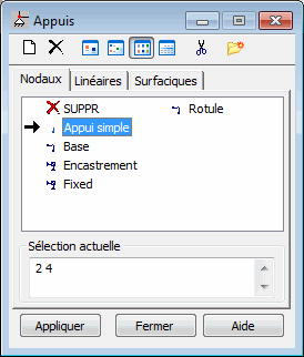 - La partie centrale, qui affiche la liste des appuis actifs; Le nombre d’onglets dépend du type de la structure.