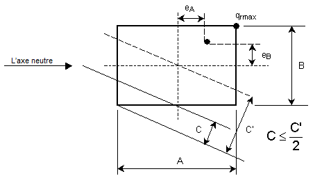 Le noyau généralisé a été introduit à cause de la limitation de la largeur de fissure admissible sous la semelle dans le cas où le soulèvement de la base de semelle a lieu 2.3 a. La norme admet l’apparition de la fissure entre le sol et la base de la semelle. L’étendue de cette fissure ne doit pas excéder la moitié de C’, entre la droite parallèle à l’axe neutre passant par le centre de gravité de la base entière et le point extrême de la base opposée au point dans lequel la valeur maximale de la contrainte q rmax est présente. La valeur maximale admissible de la fissure pour le noyau II est donc égale à 0.5 et résulte de la proportion C/C’. Par exemple, si eB = 0, C = A/4, a C’ = A/2.