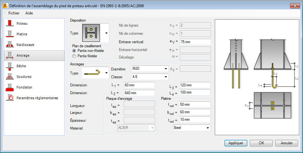 Les options disponibles dans la zone Ancrages permettent de définir les paramètres des boulons d'ancrage. Dans le champ Type, vous pouvez choisir un des 4 types des boulons d'ancrage et définir le diamètre et le matériau. Les champs concernant les dimensions du boulon d'ancrage (L1, L2, L3 et L4) permettent de définir les longueurs de chaque segment du boulon. Les paramètres des plaques d'ancrage et des platines sont définis dans les zones appropriées.