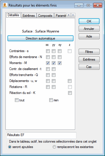 - Contraintes : sxx, syy, sxy, sz Ajoute des colonnes pour (respectivement) les valeurs de contrainte sxx, syy, sxy ou sz, pour les éléments finis de charge surfacique dans le repère local sélectionné au moment de l'analyse de la structure.