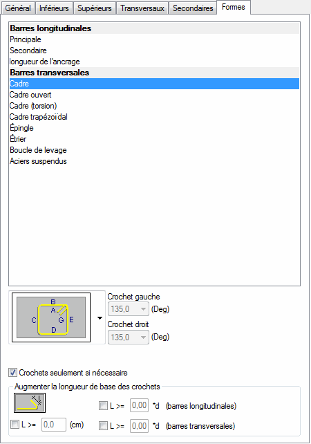 Les options de cette boîte de dialogue vous permettent de sélectionner les formes des armatures longitudinales et transversales. Pour les barres transversales, la forme d'épingle ou de cadre est sélectionnée. Pour les barres transversales, vous pouvez choisir les formes suivantes : cadre, épingle ou boucle de levage. De la même façon vous pouvez sélectionner la forme des barres longitudinales principales et secondaires. Pour chaque extrémité de la barre, vous pouvez sélectionner le type d'extrémité (crochets à angles de courbure différents).