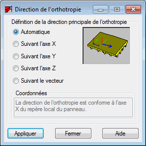 Utilisez la boîte de dialogue Direction de l'orthotropie pour définir la direction principale d'une orthotropie donnée (la direction équivalente à la direction xxx dans la matrice de rigidité xx). Le vecteur défini est projeté sur le plan du panneau. Pour ouvrir la boîte de dialogue, cliquez sur la direction X dans l'onglet Orthotropique de la boîte de dialogue Nouvelle épaisseur.