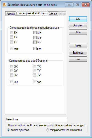 Sélectionnez l’onglet Forces pseudostatiques dans la boîte de dialogue Sélection des valeurs pour les nœuds afin de sélectionner les composants d’effort pseudostatique pour la présentation.