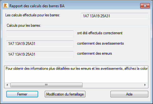Si le logiciel a détecté des erreurs ou des avertissements lors du dimensionnement des barres BA, la partie inférieure affiche le message informant l'utilisateur sur la façon d'obtenir des informations sur ces erreurs et avertissements.