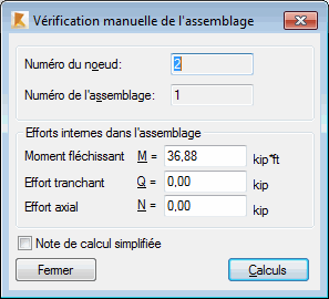 Cliquez sur ce bouton Calculs pour lancer les calculs du type d'assemblage sélectionné pour le nœud de structure étudié. Définissez les efforts internes dans l’assemblage (M, Q, N).