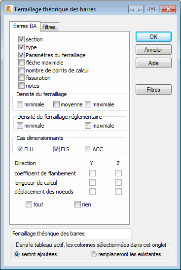 Vous pouvez sélectionner les grandeurs dont les valeurs seront affichées dans le tableau des résultats pour l'armature théorique des barres composant la structure.