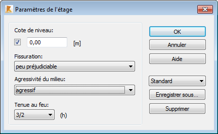 La boîte de dialogue Paramètres de l'étage permet de définir les paramètres caractéristiques d'un étage conformément à la norme française (BAEL).