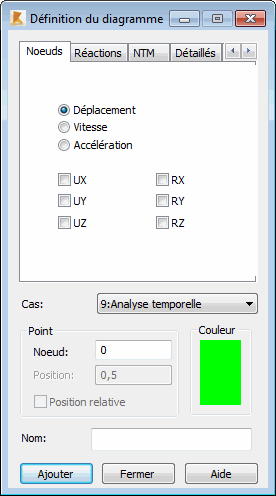 Comme exemple, nous présenterons la création du diagramme pour les nœuds de la structure dans l’onglet montré sur la figure ci-dessus. En fonction de l’option sélectionnée (déplacement, vitesse, accélération), la boîte de dialogue présente différentes grandeurs :