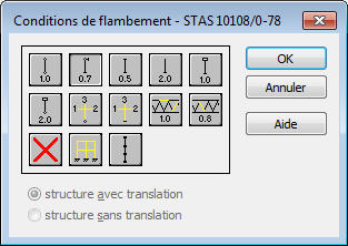 Le coefficient de longueur de flambement est saisi de façon automatique après la sélection d’une icône représentant les conditions d’appui aux extrémités de la barre. Les icônes sont divisées en deux groupes : le premier contient les méthodes par défaut (réglementaires) d'appui des barres et les valeurs de coefficient de flambement correspondantes, tandis que l'autre contient des icônes permettant de calculer le coefficient de flambement des poteaux des portiques à plusieurs étages (calcul du coefficient de longueur de flambement pour 1, 3 et 6 barres aboutissantes). Un double clic effectué sur une des icônes représentant le symbole du coefficient de longueur de flambement entraîne l’ouverture d’une boîte de dialogue supplémentaire.