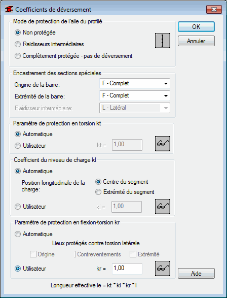 Cette option permet de définir les distances entre les sections transversales des barres protégées contre la torsion, c’est-à-dire la longueur de déversement des poutres. Pour accéder à cette option, cliquez sur Aile supérieure ou Aile inférieure dans le champ Paramètres de déversement de la boîte de dialogue Définition des barres - paramètres.