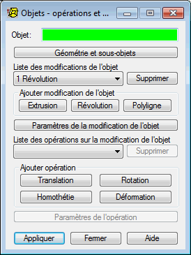 L’option sert à 1) créer des éléments volumiques simples en utilisant les opérations d’extrusion ou de révolution des objets 2D; 2) à effectuer les modifications des objets créés. L’option est accessible par la commande Edition > Modifier sous-structure > Modifier objets.
