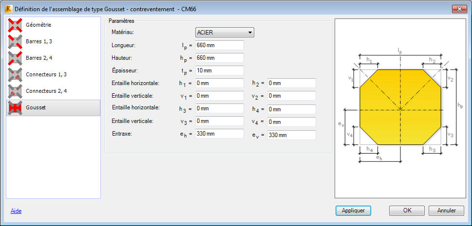 Les options disponibles sur cet onglet permettent de déterminer les paramètres géométriques du gousset ; sur cet onglet, vous pouvez aussi sélectionner le matériau du gousset.