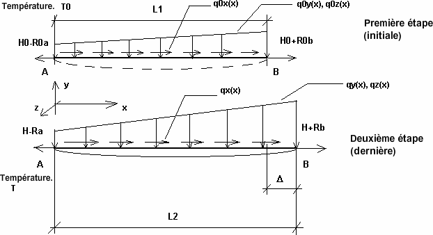 Prenons en considération un câble extensible à flèche peu importante (câble présentant un angle réduit la tangente à un point quelconque du câble et la droite reliant ses deux extrémités), et appliquons-lui une charge quelconque dans son plan. Supposons un élément infinitésimal dans ce câble, décrit à l'étape initiale (première phase d'assemblage) par la charge q0, la température T0 et la tension H0 ; la longueur de cet élément est égal à dso (Fig. 1a). Après l’application de la charge (deuxième, finale étape du câble) pour le chargement q, température T et tension H, la longueur du segment élémentaire du câble est égale à ds (fig.1b). Les deux étapes avec les charges dans les deux plans (xy et xz) sont représentées en Fig. 2.
