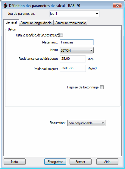 L'onglet Général de la boîte de dialogue Définition des paramètres de calcul pour la norme BAEL est présenté ci-dessous :