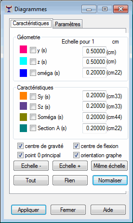 Après la sélection de l’onglet Propriétés de la boîte de dialogue Diagrammes (section à parois minces), vous pouvez sélectionner les propriétés des sections à parois minces dont les diagrammes sont présentés.