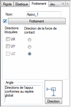 Les options disponibles sur cet onglet permettent de définir le type d’appui avec la prise en compte du frottement. Si vous activez l’option Frottement (