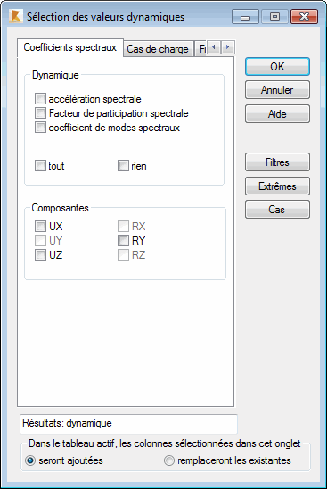 - Composants. Selon la sélection effectuée dans la boîte de dialogue, des colonnes indiquant les composants UX,UY, UZ, RX, RY ou RZ des valeurs Coefficient des modes spectraux, Coefficients de participation spectrale et Coefficient spectral, s'affichent.