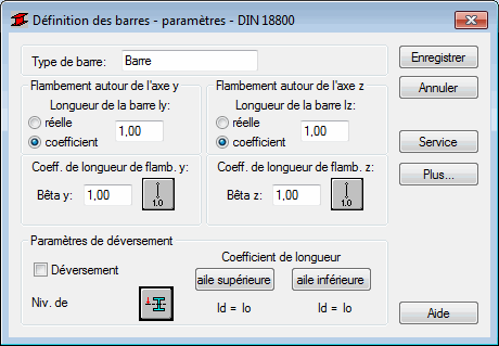 Dans le champ Coeff. de longueur de flamb., vous pouvez définir les coefficients de longueur de flambement de la barre en deux directions. Le logiciel propose automatiquement la longueur réelle de la barre (ou, éventuellement, la longueur totale des barres composantes).
