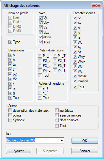 Sélectionnez les valeurs à afficher dans la section de table des propriétés. Colonnes principales et Toute les colonnes (le tableau présente toutes les colonnes disponibles) sont les deux jeux de colonnes par défaut. Ces jeux ne peuvent pas être modifiés. Cependant, les jeux définis par l'utilisateur peuvent être modifiés à tout moment.