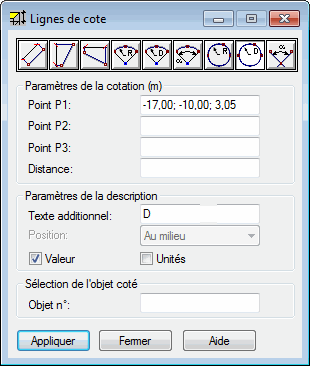 Dans la partie supérieure de la boîte de dialogue, vous trouverez les options permettant de sélectionner le type de la ligne de cote. Vous pouvez définir une ligne de cote graphiquement ou en entrant des valeurs dans les champs appropriés de la boîte de dialogue.