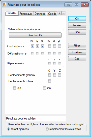 Sélectionnez l'onglet Détaillés (solides), dans la boîte de dialogue Colonnes, pour choisir les grandeurs de contraintes, de déformations et de déplacements pour la présentation.