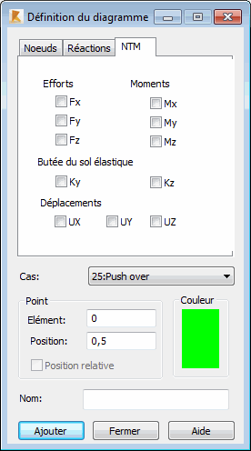 Le diagramme est généré pour une seule valeur de résultat. Cette grandeur doit être sélectionnée dans d'un des onglets disponibles (le nombre d'onglets dépend du type de structure analysée : portique, plaque, etc.). De plus, vous devez désigner l'élément (barre) ou le nœud pour lequel le diagramme sera présenté. Dans le cas des grandeurs pour les barres, le champ Position est accessible; ce champ définit la coordonnée relative sur la barre pour laquelle les résultats sont affichés. Dans le cas des éléments surfaciques, les valeurs des forces et des contraintes sont lu sur les centres des éléments.